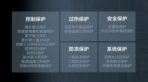 基本的安全功能是必不可少的:自動(dòng)診斷、漏電保護(hù)、缺水保護(hù)、防凍保護(hù)、水泵防卡死保護(hù)、水泵旁路保護(hù)、水流量監(jiān)控裝置、防干燒和超溫保護(hù)、供暖系統(tǒng)過(guò)壓安全保護(hù)、熄火保護(hù)、水溫傳感器失效保護(hù)等等。