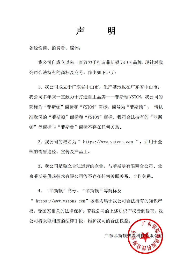 我公司自成立以來一直致力于打造菲思盾VSTON品牌,現針對我公司合法持有的商標及商號,作出如下聲明: