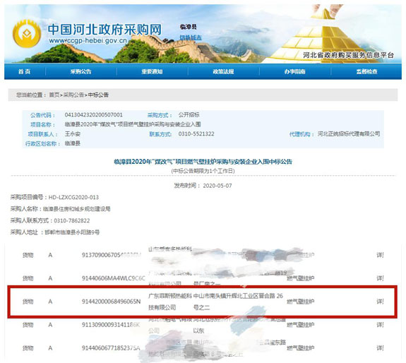 臨漳縣2020年“煤改氣”項目燃氣壁掛爐采購與安裝企業入圍中標公告