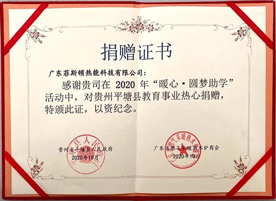 今天,我們收到了由廣東省燃氣采暖熱水爐協會寄來的捐贈證書,以表彰菲思盾在“暖心·圓夢助學”活動中的慷慨表現。