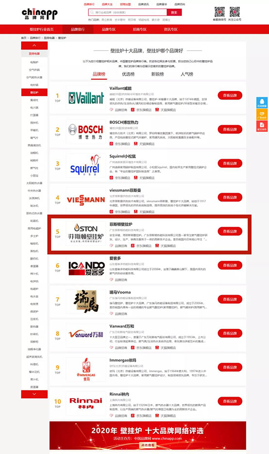 實力見證大品牌,菲思盾榮登中國壁掛爐十大品牌榜第五