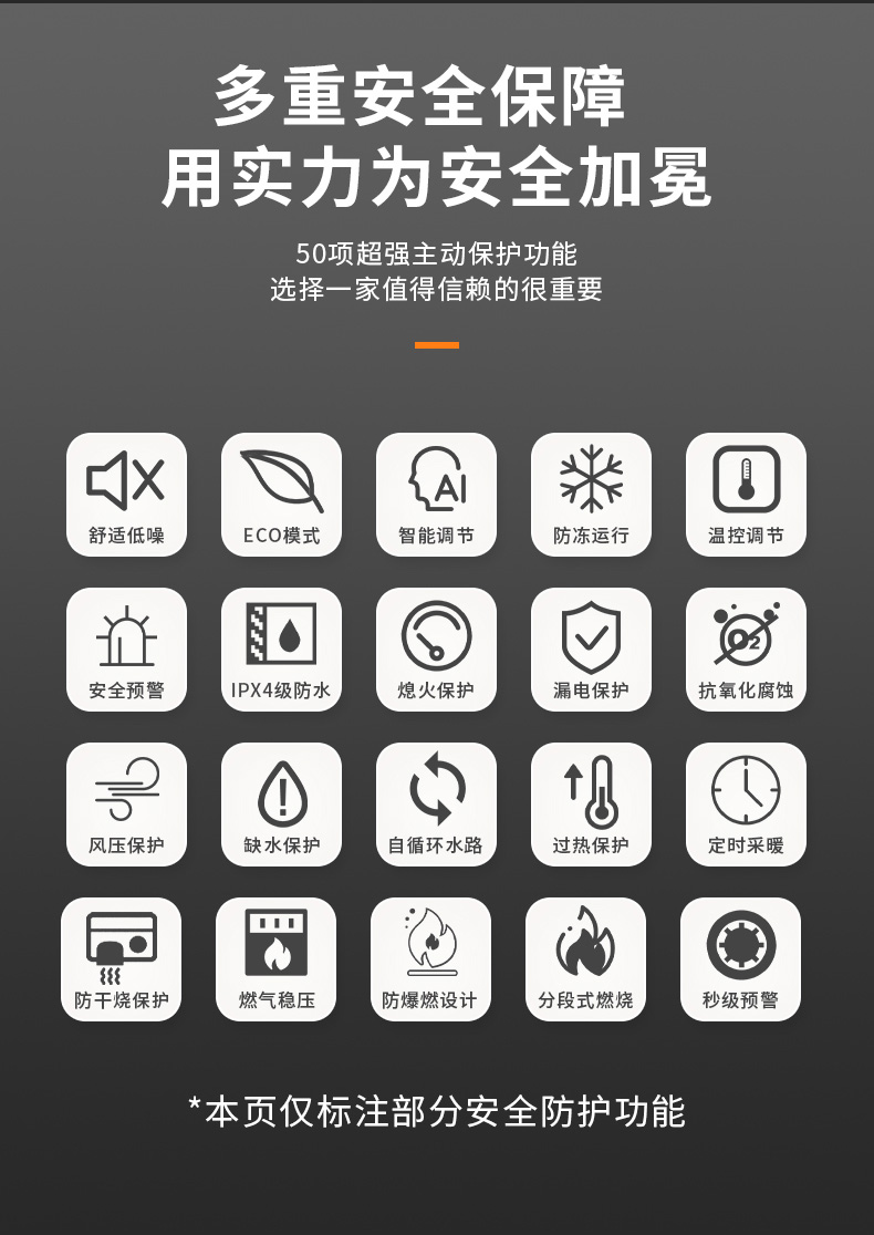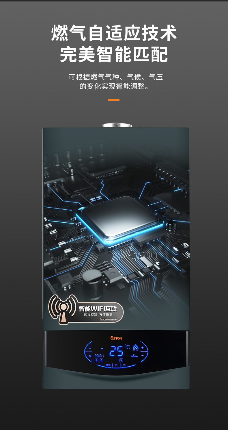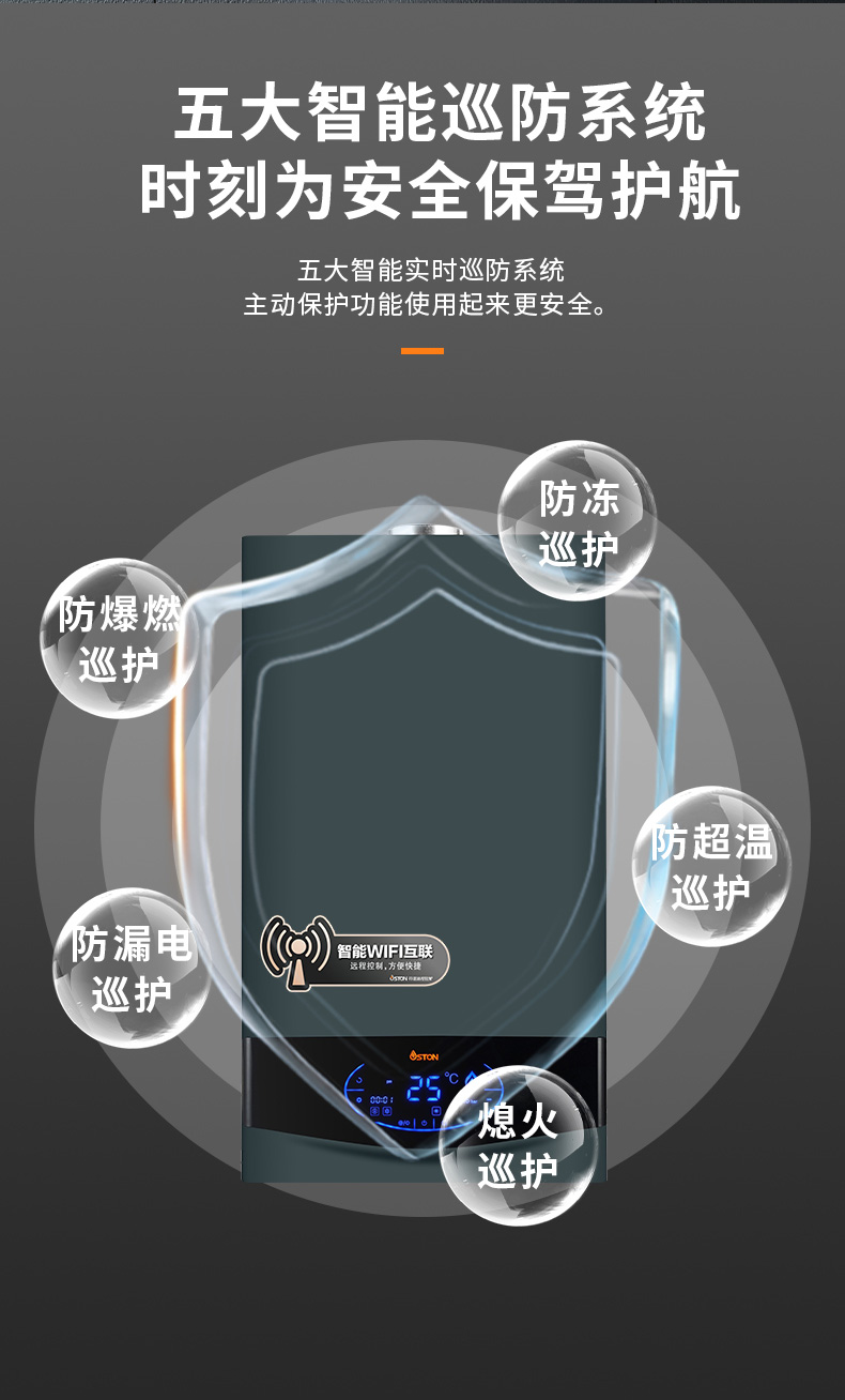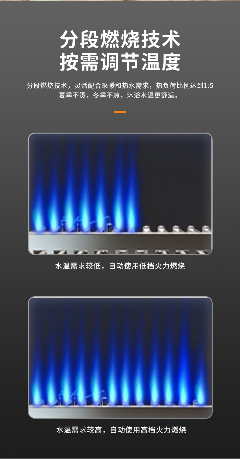 分段式燃燒,熱負荷調節比1:5,徹底解決夏季水溫過高燙傷安全問題。