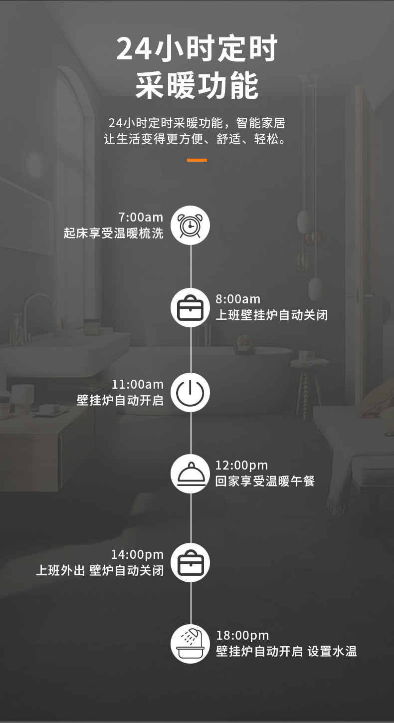 24小時定時采暖功能,生活更節能、更方便、更舒適。
